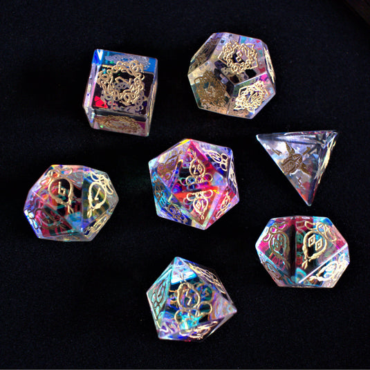 Each die is hand carved from glass pieces and polished in a proper tumbler. Designs are then engraved into each side and hand painted. Our dice sets are always well weighted and well balanced.