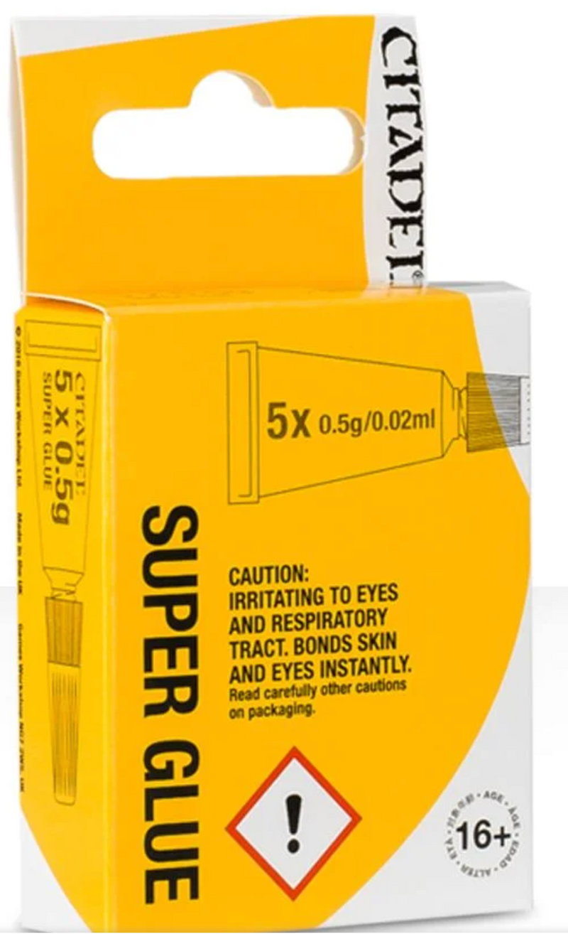 Citadel Super Glue is specifically designed for the assembly of metal and resin Citadel and Forge World miniatures. This glue is supplied in five 0.5g aluminium tubes, to be used as needed.