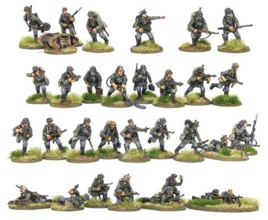 • Enough plastic and metal components to make 31 German Pionier miniatures. Includes a host of options to allow for different weapon configurations and command models.