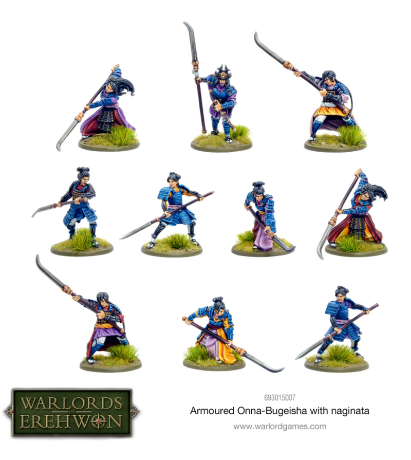The Onna-bugeisha (female martial artist) are members of the samurai Class of fierce warriors. They are as adept at both campaigning and defending their households and families, Though trained with all weapons, these honourable warriors favour the heavy-bladed naginata Clad in protective yet flexible armour these Onna-bugeisha wield their iconic naginata with deadly skill and grace – woe betide those foolish enough to cross their path…